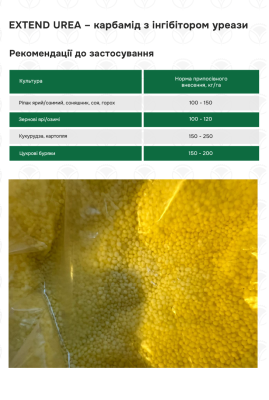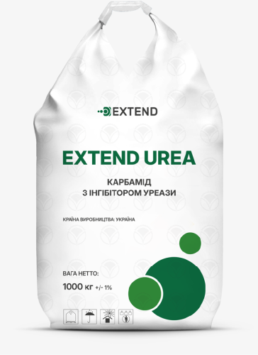 EXTEND UREA містить інгібітор уреази, який тимчасово блокує перетворення амідного азоту в амонійний (до 2 тижнів), забезпечує поступове вивільнення азоту, завдяки чому знижує втрати азоту через випаровування.