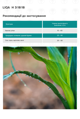 Liqa H 3:18:18 – рідке трикомпонентне стартове добриво, з високим вмістом фосфору у вигляді ортофосфатів, та калієм, що не містить хлору. Використовується для всіх видів сільськогосподарських культур в якості стартового припосівного добрива (технологія Pop-Up), позакореневого підживлення та фертигації, забезпечуючи рослини необхідними елементами живлення. Калій не містить хлору (Сl).