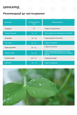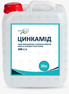 ЦИНКАМІД - це концентроване рідке легкозасвоюване добриво з цинком і сіркою. Цинк відіграє важливу роль в житті рослин. Під впливом цинку підвищується загалтний вміст вуглеводів, крохмалю та білку. Відіграє важливу роль у синтезі ауксинів. Цинк підвищує стійкість рослин до температурних стресів. За нестачі цинку на листях рослин спостерігається хлороз, пригнічується поділ клітин, відбувається затримка росту рослин. Добриво запобігає дефіциту цинку та корегує його вміст в рослині. Разом із амідним азотом, в рослину потрапляє сірка, що міститься в даному мікродобриві через кутикулу листків, покращуючи фотосинтез. Сприяє формуванню зав'язі та підвищенню урожайності.